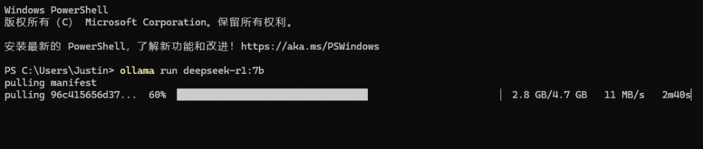 其中deepseek-r1 是模型名,7b 是参数量,用于选择模型(不写则会按照默认下载但建议加上)