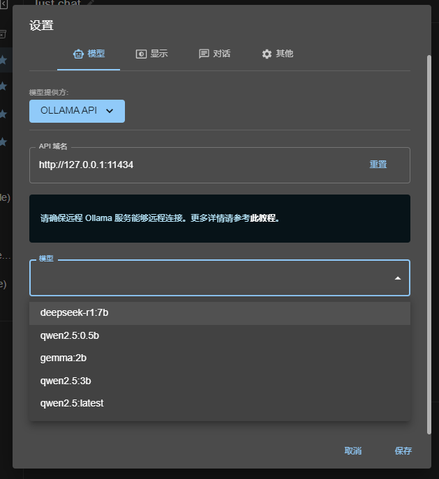 选择Ollama API ,只要Ollama是开着的,应该就能在下拉框中找到你的模型