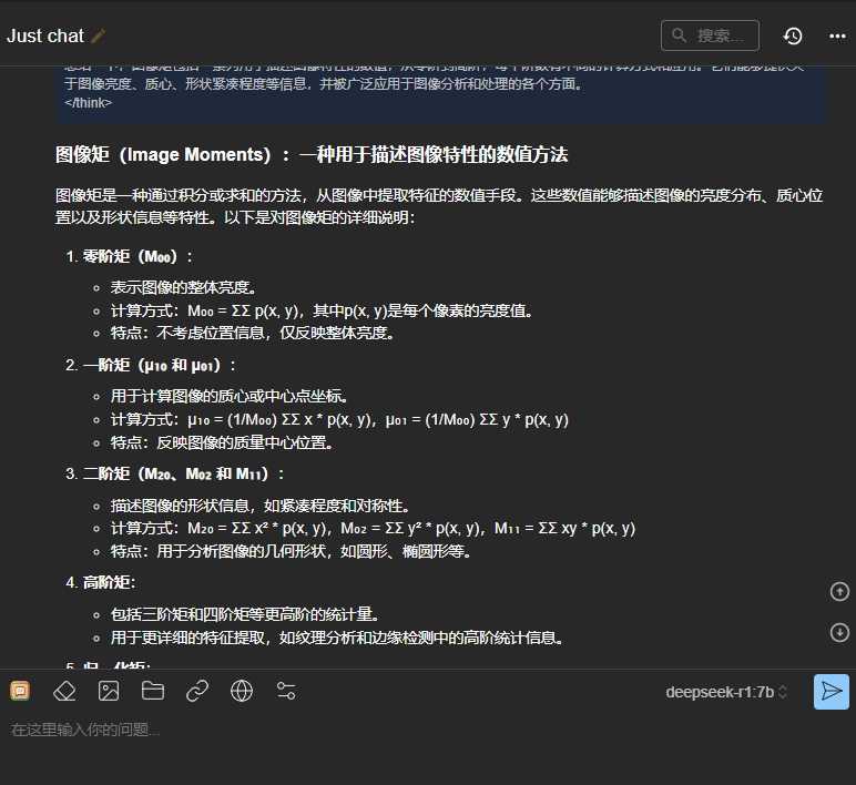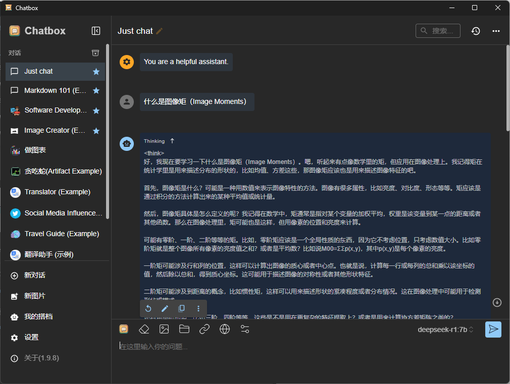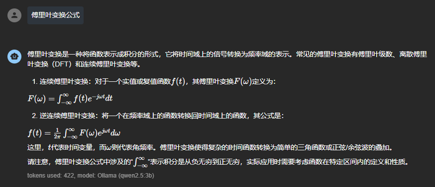 可以看到,对于一般的对话场景,终端的使用尚可接受,但一旦涉及数学公式等内容,终端的表现就显得有些简陋了。因此,我们可以使用 Chatbox 作为更友好的聊天界面。当然,这是可选的,取决于你的使用需求(见实例)。
