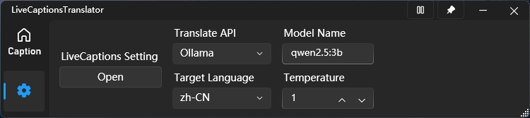 用于将翻译 API 集成到 Win11 的实时字幕中,以实现实时语音翻译。其中软件提供 Ollama API 的选项,因此,我们可以将我们的模型名输入以实现效果: