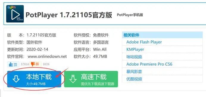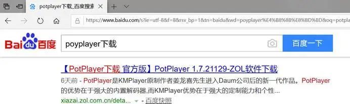 首先我们在搜索栏输入“PotPlayer下载”,我们以“ZOL下载站”为例,点击进入网站,我们可以看到界面如下图。此时我们应当避免点击“高速下载”、“极速下载”等字样 ,寻找“下载地址”、“本地下载”等字样,并注意自己点击的图块附近是否有“广告”、“推荐”等角标,下图点击圈内“本地下载”即可。
