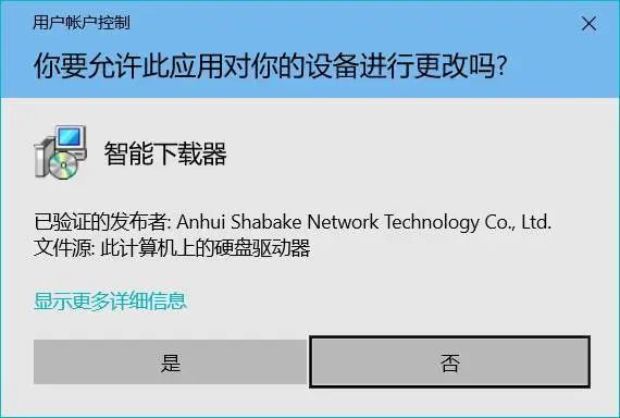 当我们双击运行我们下载完成的文件时通常会弹出“用户帐户控制”窗口,若出现“智能(高速/软件)下载器”字样,我们应点击“否”以阻止运行 。