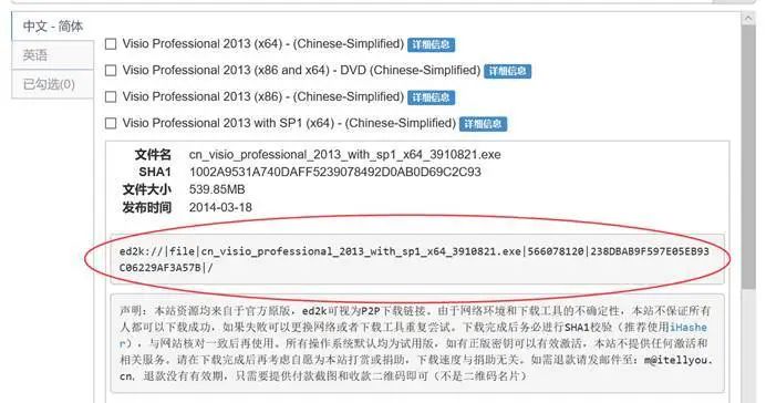 我们在右侧找到我们所需版本并点击“详细信息”,红圈中的“ed2k”开头的字符串即为下载链接,我们需要使用“迅雷”进行下载。
