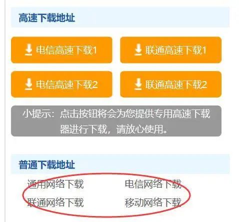 接下来我们会来到下图界面,我们应找到“普通下载地址”、“其他下载地址”类,远离“高速”、“下载器”字样 ,发现“电信”“联通”“移动”即可随意点击其一以完成下载。